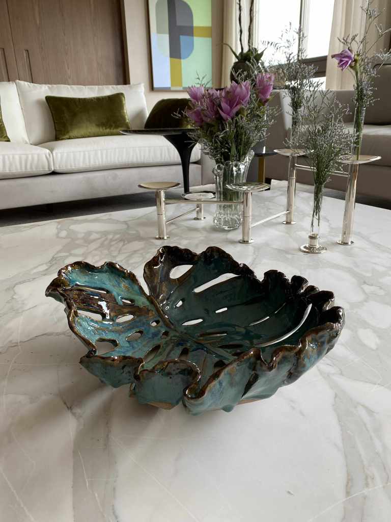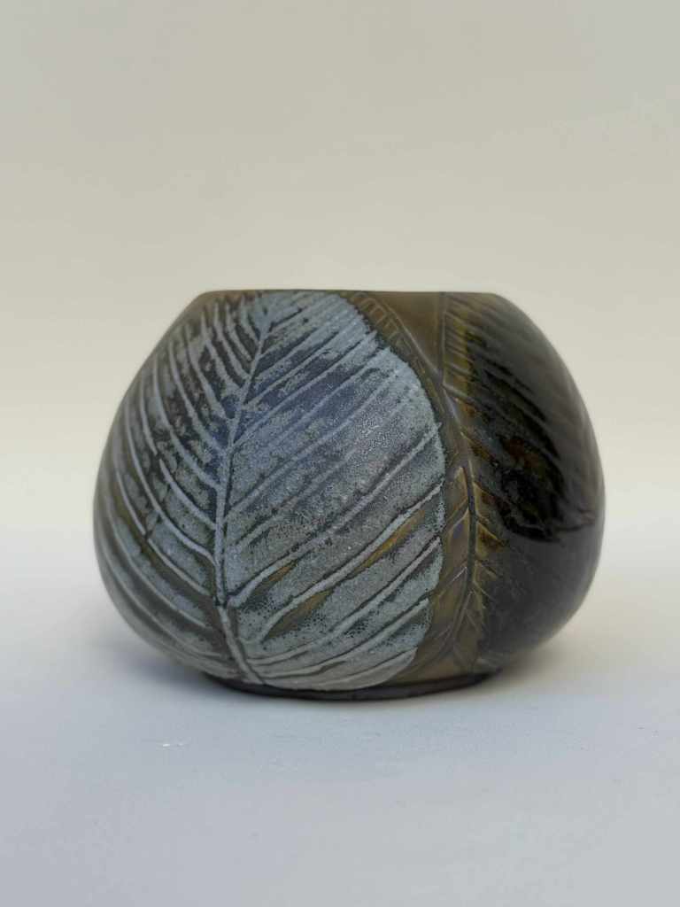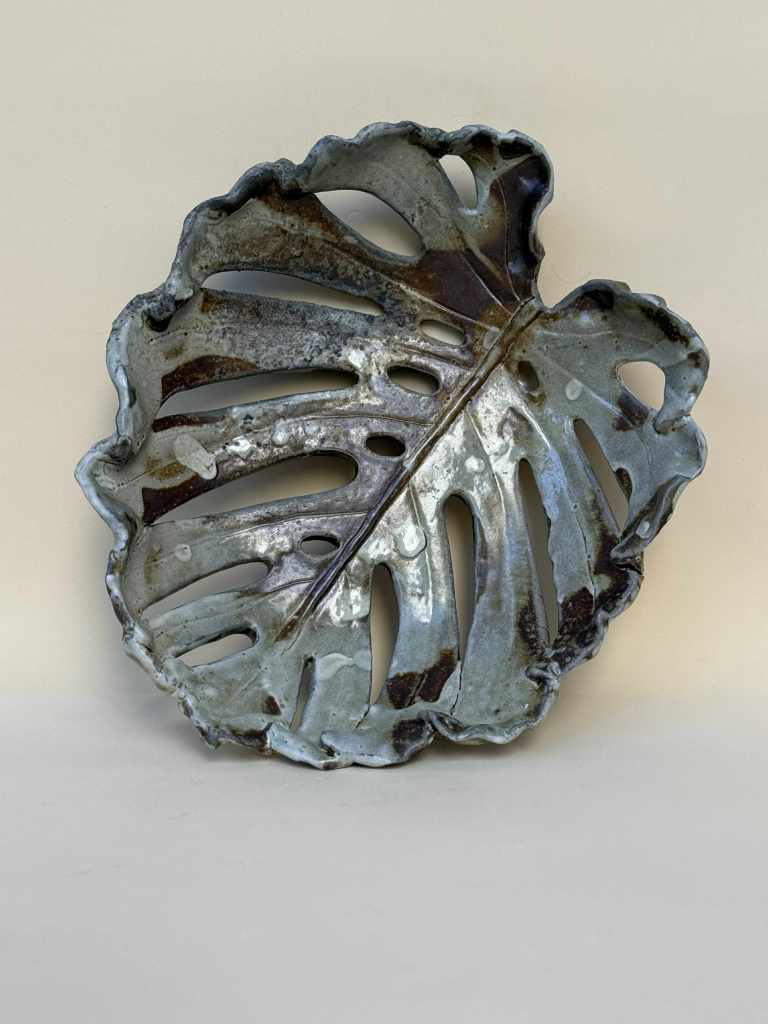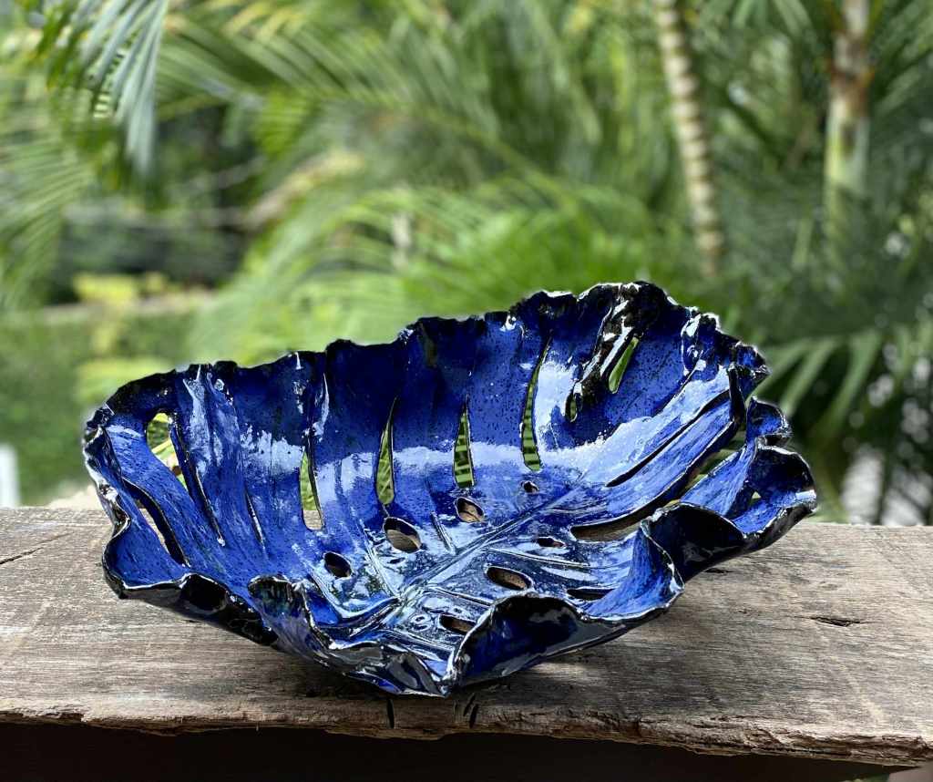 Marketa Adamek Bastos is a Lisbon based Swedish ceramic artist. But she prefers to be called a global nomad due to her roaming lifestyle. Outside of Marketa’s studio there is always a green garden. She likes to start her creative process with a nature walk, and when something interesting catches her eye she brings it back to her atelier. She works with high fire stoneware clay, which she rolls into slabs and prints her leaves on and then shapes into bowls and plates. Her vases are a combination of wheel thrown and coiling work. Some vases are altered or carved. All of Marketa’s pieces are covered in exuberant colored glazes. She enjoys creating her own unique glazes from minerals, oxides and wood ash. Each piece is fired in an electrical kiln to cone 8 or 9. Whenever possible she also fires in a wood kiln. Each piece will be refired until a desired result is achieved. Due to rising environmental concerns, Marketa works with a small production based on careful planning and understanding of the raw materials to reduce waste and mishaps.