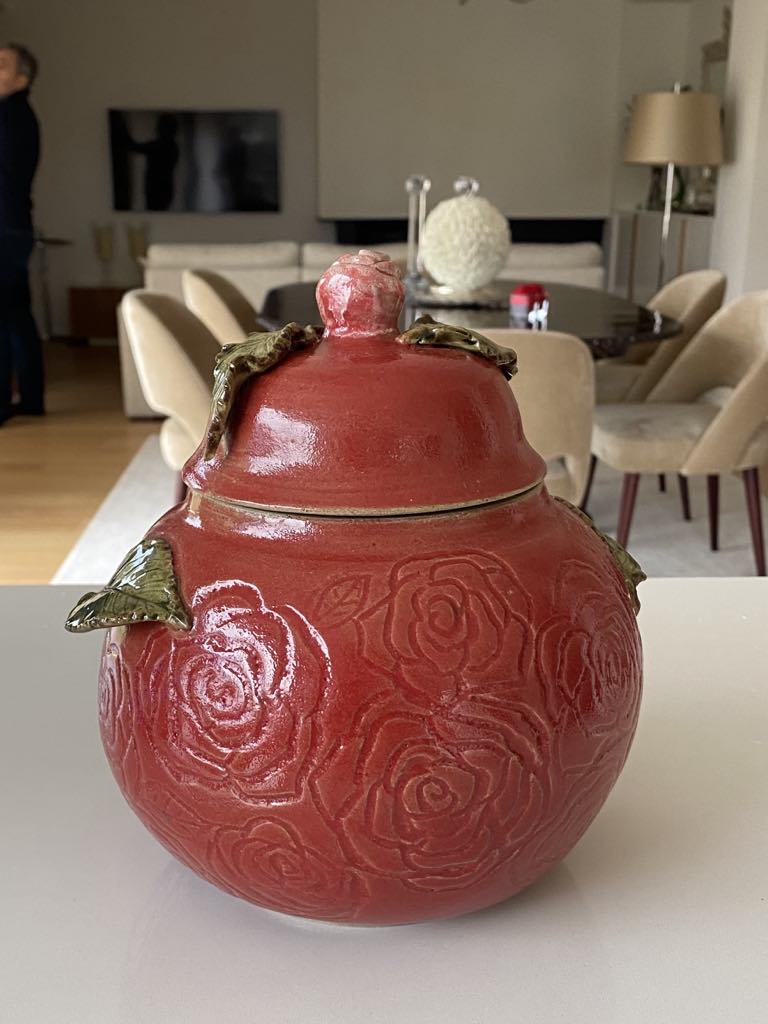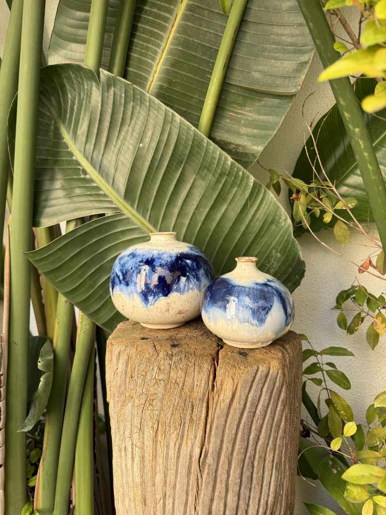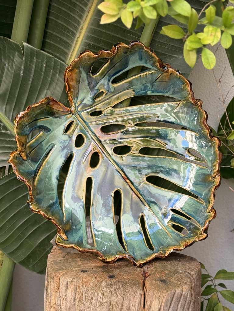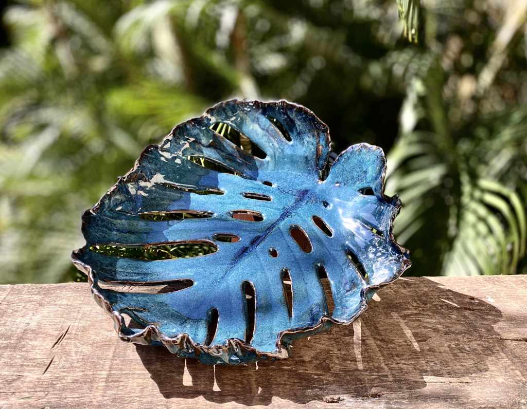 Marketa Adamek Bastos is a Lisbon based Swedish ceramic artist. But she prefers to be called a global nomad due to her roaming lifestyle. Outside of Marketa’s studio there is always a green garden. She likes to start her creative process with a nature walk, and when something interesting catches her eye she brings it back to her atelier. She works with high fire stoneware clay, which she rolls into slabs and prints her leaves on and then shapes into bowls and plates. Her vases are a combination of wheel thrown and coiling work. Some vases are altered or carved. All of Marketa’s pieces are covered in exuberant colored glazes. She enjoys creating her own unique glazes from minerals, oxides and wood ash. Each piece is fired in an electrical kiln to cone 8 or 9. Whenever possible she also fires in a wood kiln. Each piece will be refired until a desired result is achieved. Due to rising environmental concerns, Marketa works with a small production based on careful planning and understanding of the raw materials to reduce waste and mishaps.